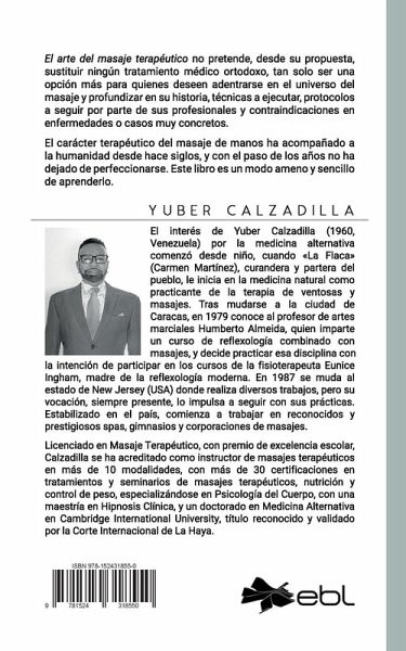 El interés de Yuber Calzadilla (1960, Venezuela) por la medicina alternativa comenzó desde niño, cuando La Flaca (Carmen Martínez), curandera y partera del pueblo, le inicia en la medicina natural como practicante de la terapia de ventosas y masajes. Tras mudarse a la ciudad de Caracas, en 1979 conoce al profesor de artes marciales Humberto Almeida, quien imparte un curso de reflexología combinado con masajes, y decide practicar esa disciplina con la intención de participar en los cursos de la fisioterapeuta Eunice Ingham, madre de la reflexología moderna. En 1987 se muda al estado de New Jersey (USA) donde realiza diversos trabajos, pero su vocación, siempre presente, lo impulsa a seguir con sus prácticas. Estabilizado en el país, comienza a trabajar en reconocidos y prestigiosos spas, gimnasios y corporaciones de masajes. Licenciado en Masaje Terapéutico, con premio de excelencia escolar, Calzadilla se ha acreditado como instructor de masajes terapéuticos en más de 10 modalidades, con más de 30 certificaciones en tratamientos y seminarios de masajes terapéuticos, nutrición y control de peso, especializándose en Psicología del Cuerpo, con una maestría en Hipnosis Clínica, y un doctorado en Medicina Alternativa en Cambridge International University, título reconocido y validado por la Corte Internacional de La Haya.