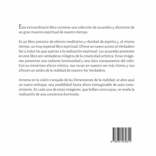 Este extraordinario libro contiene una colección de acuarelas y aforismos de un gran maestro espiritual de nuestro tiempo. Es un libro precioso de silencio meditativo y claridad de espíritu y, al mismo tiempo, un muy especial libro espiritual. Ofrece un nuevo acceso al Verdadero Ser a todos los que aspiran a la realización espiritual. Las acuarelas presentes en este libro son verdaderos milagros de la creatividad artística. Estas imágenes presentan una radiante luminosidad y una clara transparencia del color. Con su misterioso efecto místico, nos tocan en nuestro ser más íntimo y nos ofrecen un atisbo de la realidad de nuestro Ser Verdadero. Inmerso en la visión tranquila de las Dimensiones de la realidad, se abre aquí un nuevo enfoque, una posibilidad hasta ahora inimaginable de auto-conocimiento. En cada una de estas imágenes, que brillan como joyas, se revela la realización de una conciencia iluminada.