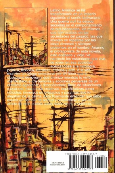 Obra completa. Latino América se ha transformado en un imperio siguiendo el sueño bolivariano. Una guerra civil ha dejado secuelas en el comportamiento de sus habitantes, las mismas que han existido en las sociedades del pasado, las que insisten en repetirse por las ideas diversas y siempre presentes en el hombre. Arianno, el protagonista de esta novela, está acabado y viejo, va narrando los estándares que vive de joven en esa sociedad acercándose a la mitología, política, filosofía, literatura, historia y arte. A la vez, muestra un apego emocional por un amor que lo obsesionó de joven y que divinizó mientras lo vivió, manifestado entre temores y acciones perversas de un erotismo agobiante y descontrolado, lleno de situaciones macabras, raciocinios creativos, especulativos como ridículos, inmersos en prejuicios y parafilias que lo alejaban de la calma, para finalmente entender que debe asumir un cambio de actitud y proyectarse a ser un artista en este pueblo como razón de su existencia.