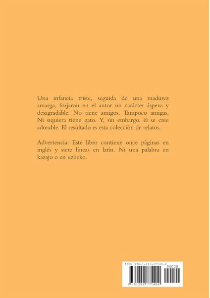 Una infancia triste, seguida de una madurez amarga, forjaron en el autor un carácter áspero y desagradable. No tiene amigos. Tampoco amigas. Ni siquiera tiene gato. Y, sin embargo, él se cree adorable. El resultado es esta colección de relatos. Advertencia: Este libro contiene once páginas en inglés y siete líneas en latín. Ni una palabra en kazajo o en uzbeko.