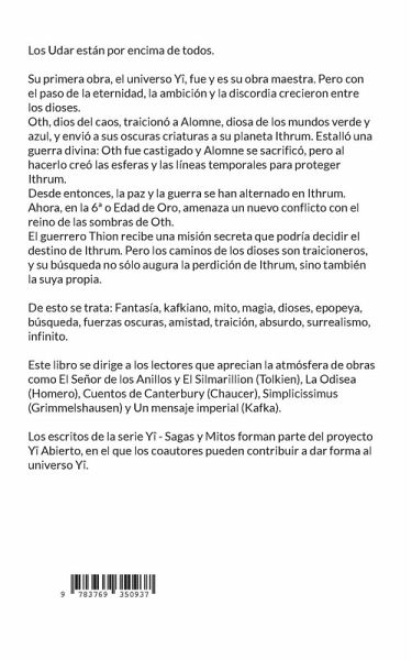Los Udar están por encima de todos. Su primera obra, el universo Yî, fue y es su obra maestra. Pero con el paso de la eternidad, la ambición y la discordia crecieron entre los dioses. Oth, dios del caos, traicionó a Alomne, diosa de los mundos verde y azul, y envió a sus oscuras criaturas a su planeta Ithrum. Estalló una guerra divina: Oth fue castigado y Alomne se sacrificó, pero al hacerlo creó las esferas y las líneas temporales para proteger Ithrum. Desde entonces, la paz y la guerra se han alternado en Ithrum. Ahora, en la 6ª o Edad de Oro, amenaza un nuevo conflicto con el reino de las sombras de Oth. El guerrero Thion recibe una misión secreta que podría decidir el destino de Ithrum. Pero los caminos de los dioses son traicioneros, y su búsqueda no sólo augura la perdición de Ithrum, sino también la suya propia. De esto se trata: Fantasía, kafkiano, mito, magia, dioses, epopeya, búsqueda, fuerzas oscuras, amistad, traición, absurdo, surrealismo, infinito. Este libro se dirige a los lectores que aprecian la atmósfera de obras como El Señor de los Anillos y El Silmarillion (Tolkien), La Odisea (Homero), Cuentos de Canterbury (Chaucer), Simplicissimus (Grimmelshausen) y Un mensaje imperial (Kafka). Los escritos de la serie Yî - Sagas y Mitos forman parte del proyecto Yî Abierto, en el que los coautores pueden contribuir a dar forma al universo Yî.