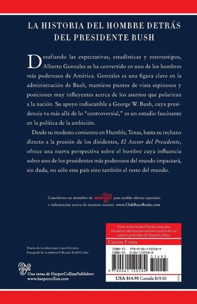 Desafiando las expectativas, estadísticas y estereotipos, Alberto Gonzales se ha convertido en uno de los hombres más poderosos de América. Gonzales es una figura clave en la administración de Bush, mantiene puntos de vista espinosos y posiciones muy influyentes acerca de los asuntos que polarizan a la nación. Su apoyo indiscutible a George W. Bush, cuya presidencia va más allá de lo "controversial," es un estudio fascinante en la política de la ambición. Desde su modesto comienzo en Humble, Texas, hasta su rechazo directo a la presión de los disidentes, El Asesor del Presidente, ofrece una nueva perspectiva sobre el hombre cuya influencia sobre uno de los presidentes más poderosos del mundo impactará, sin duda, no sólo este país sino también el resto del mundo.