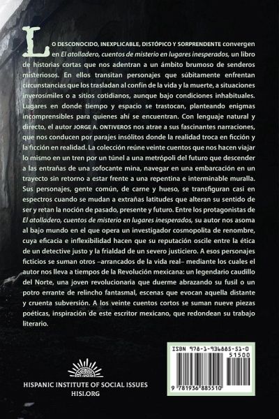 (English description below) Lo desconocido, inexplicable, distópico y sorprendente convergen en El atolladero, cuentos de misterio en lugares inesperados, un libro de historias cortas que nos adentran a un ámbito brumoso de senderos misteriosos. En ellos transitan personajes que súbitamente enfrentan circunstancias que los trasladan al confín de la vida y la muerte, a situaciones inverosímiles o a sitios cotidianos, aunque bajo condiciones inhabituales. Lugares en donde tiempo y espacio se trastocan, planteando enigmas incomprensibles para quienes ahí se encuentran. Con lenguaje natural y directo, el autor Jorge A. Ontiveros nos atrae a sus fascinantes narraciones, que nos conducen por parajes insólitos donde la realidad troca en ficción y la ficción en realidad. La colección reúne veinte cuentos que nos hacen viajar lo mismo en un tren por un túnel a una metrópoli del futuro que descender a las entrañas de una sofocante mina, navegar en una embarcación en un trayecto sin retorno a estar frente a una repentina e interminable muralla. Sus personajes, gente común, de carne y hueso, se transfiguran casi en espectros cuando se mudan a extrañas latitudes que alteran su sentido de ser y retan la noción de pasado, presente y futuro. Entre los protagonistas de El atolladero, cuentos de misterio en lugares inesperados, su autor nos asoma al bajo mundo en el que opera un investigador cosmopolita de renombre, cuya eficacia e inflexibilidad hacen que su reputación oscile entre la ética de un detective justo y la frialdad de un severo justiciero. A esos personajes ficticios se suman otros -arrancados de la vida real- mediante los cuales el autor nos lleva a tiempos de la Revolución mexicana: un legendario caudillo del Norte, una joven revolucionaria que duerme abrazando su fusil o un potro errante de relincho fantasmal, escenas que evocan aquella distante y cruenta subversión. A los veinte cuentos cortos se suman nueve piezas poéticas, inspiración de este escritor mexicano, que redondean su trabajo literario. ¿El atolladero, cuentos de misterio en lugares inesperados (The quagmire, mystery tales in unexpected places) is a book written in Spanish consisting of a collection of twenty short stories written by author Jorge A. Ontiveros. Most of the stories describe characters who suddenly find themselves in strange situations, unknown places, or dystopian scenarios. These diverse characters reach a point where they get stuck -literally and metaphorically- facing circumstances that defy their reason, puzzles them, and pushes them to life-and-death latitudes, sometimes with no return. The author employs everyday language through nitid prose very easily to understand. In addition to his stories, Jorge A. Ontiveros shares nine poems as a bonus to readers.