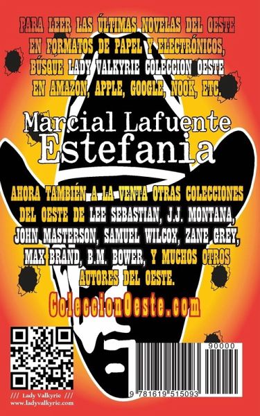 Lady Valkyrie Colección Oeste(R) >...Y en el viejo y legendario Oeste, la frontera era el último refugio de muchos asesinos y cuatreros, quienes, con la ayuda de militares corruptos, campan a sus anchas, hasta que un vaquero y un patrullero toman medidas para devolver la ley a toda la zona... En el salvaje oeste Americano, también conocido como "far west" o "wild west", los vaqueros (cowboys) y los pistoleros (gunman) se repartían las aventuras a partes iguales siendo héroes y villanos, dependiendo de la zona y de la situación en la que se encontraban. Los famosos relatos sobre el viejo o lejano oeste coincidieron con la exploración de los territorios vírgenes del "oeste" Americano. El estilo de vida que tuvieron en el viejo oeste estaba ligado a la explotación de las minas, la crianza de ganado, y el cultivo de la tierra. Las ciudades del viejo oeste eran unas cuantas casas de madera, una tienda para comprar los artículos variados, varias cantinas (saloons), la oficina con cárcel del sheriff, una pequeña escuela, y a veces un local de oración. Era una época de violencia, donde es habitual el uso del plomo y de la cuerda, para solucionar todo tipo de problemas. Y un lugar en el que la justicia del ojo por ojo era la salsa de cada día, y donde el Colt era el instrumento favorito para solucionar problemas. La Colección Oeste(R) le presenta las mejores historias del oeste en Español. Para leer las últimas novedades, visite la página internet de Amazon o nuestra página web localizada en ladyvalkyrie.com(R). También están a la venta otras colecciones del oeste en Español de los grandes autores como FRANK DUGGAN, JOHN MASTERSON, LEE SEBASTIAN, J.J. MONTANA, SAMUEL WILCOX, ZANE GREY, B.M. BOWER, MARCIAL LAFUENTE ESTEFANÍA, MAX BRAND, CARLOS CLEVELAND, y de muchos otros más. Visítenos en ColeccionOeste.com(R) para ver todas las últimas novedades. LadyValkyrie.com(R)