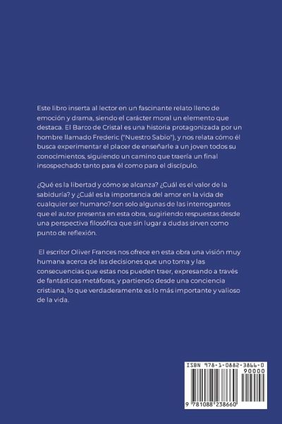 Este libro inserta al lector en un fascinante relato lleno de emoción y drama, siendo el carácter moral un elemento que destaca. El Barco de Cristal es una historia protagonizada por un hombre llamado Frederic ("Nuestro Sabio"), y nos relata cómo él busca experimentar el placer de enseñarle a un joven todos su conocimientos, siguiendo un camino que traería un final insospechado tanto para él como para el discípulo. ¿Qué es la libertad y cómo se alcanza? ¿Cuál es el valor de la sabiduría? y ¿Cuál es la importancia del amor en la vida de cualquier ser humano? son solo algunas de las interrogantes que el autor presenta en esta obra, sugiriendo respuestas desde una perspectiva filosófica que sin lugar a dudas sirven como punto de reflexión. El escritor Oliver Frances nos ofrece en esta obra una visión muy humana acerca de las decisiones que uno toma y las consecuencias que estas nos pueden traer, expresando a través de fantásticas metáforas, y partiendo desde una conciencia cristiana, lo que verdaderamente es lo más importante y valioso de la vida.