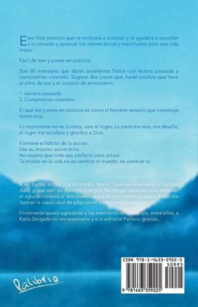 Este libro practico que te motivará a conocer y te ayudará a escuchar a tu corazón y apreciar los valores éticos y espirituales para una vida de reflexión. Fácil de leer y poner en práctica. Son 60 mensajes que darán excelentes frutos con lectura pausada y compromiso concreto. Sugiero dos pasos que, harán posible que llene el alma de paz y el corazón de entusiasmo. 1. Lectura pausada 2. Compromiso concreto El que lee y pone en práctica es como el hombre sensato que construye sobre roca. Lo importante no es la meta, sino el logro. La meta me reta, me desafía; el logro me satisface y glorifica a Dios. Fórmese el hábito de la acción. Use su impulso automático. No espere que todo sea perfecto para actuar. AGRADECIMIENTO A mi padre, Victor. Y a mi madre, Maria. Que me enseñaron a trabajar duro, y que son mi ejemplo a seguir. No tengo palabras para expresar el agradecimiento a mis padres que son mis mentores que a diario me ilustran la capacidad de adaptarme a situaciones cambiantes. A mis dos maravillosos diamantes, Eduar y Nazaret. Que me ayudan a construir "líneas rectas" en mi vida. Que hacen que la vida sea divertida. Finalmente quiero agradecer a los miembros de mi equipo, entre ellos, a Karla Delgado mi representante y a la editorial Palibrio gracias...