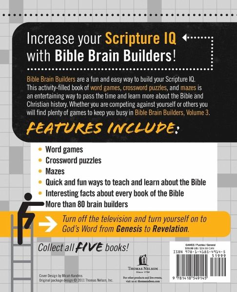 Increase your Scripture IQ with Bible Brain Builders. Word games, crossword puzzles, and mazes are an entertaining way to pass the time on trips and learn more about the stories, people, and places of the Bible. Turn off the television and turn yourself on to God's Word from Genesis to Revelation. Mazes illustrate symbols of Christian history. Collect all five books! Features include: Word games Crossword puzzles Mazes