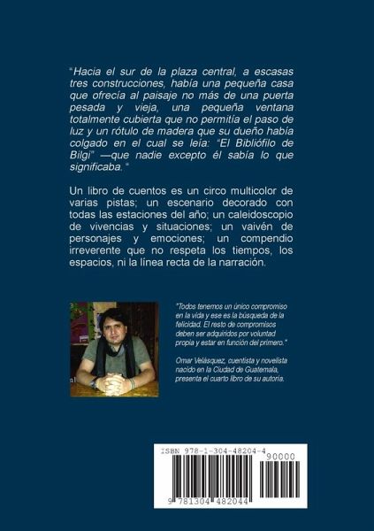 "Hacia el sur de la plaza central, a escasas tres construcciones, había una pequeña casa que ofrecía al paisaje no más de una puerta pesada y vieja, una pequeña ventana totalmente cubierta que no permitía el paso de luz y un rótulo de madera que su dueño había colgado en el cual se leía: "El Bibliófilo de Bilgi" -que nadie excepto él sabía lo que significaba-. " Un libro de cuentos es un circo multicolor de varias pistas; un escenario decorado con todas las estaciones del año; un caleidoscopio de vivencias y situaciones; un vaivén de personajes y emociones; un compendio irreverente que no respeta los tiempos, los espacios, ni la línea recta de la narración.