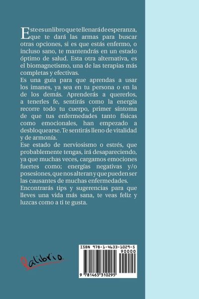 El eje principal de este libro, es el uso de imanes, como terapia de biomagnetismo utilizando para ello el par biomagnetico de su creador Dr. Isaac Goiz. Basada en mi experiencia como terapeuta en imanes, herbolaria, reflexologia y otras terapias mas, te narro a manera de platica todos los elementos necesarios que se requieren para dar una terapia, dependiendo de cada paciente en la que podría intervenir, desde una limpia, despojos de posesiones, tips para subir la autoestima, recomendaciones medicas y sobre todo una explicación sencilla y detallada de cómo poner los imanes, para mejorar y conservar la salud física, emocional y espiritual.