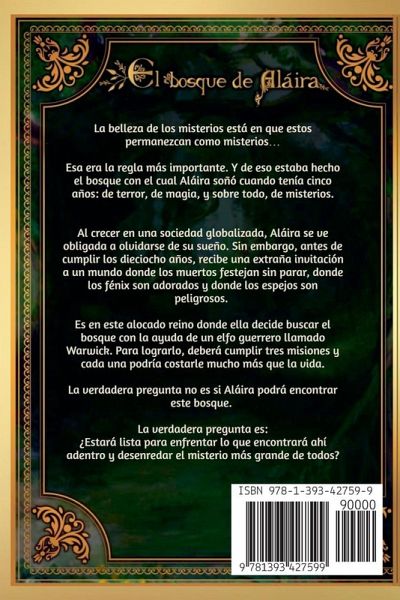La belleza de los misterios está en que estos permanezcan como misterios... Esa era la regla más importante. Y de eso estaba hecho el bosque con el cual Aláira soñó cuando tenía cinco años: de terror, de magia, y sobre todo, de misterios. Al crecer en una sociedad globalizada, Aláira se ve obligada a olvidarse de su bosque. Sin embargo, antes de cumplir los dieciocho años, recibe una extraña invitación a un mundo donde los muertos festejan sin parar, donde los fénix son adorados y donde los espejos son peligrosos. Es en este alocado reino donde ella decide buscar el bosque de sus sueños con la ayuda de Warwick un elfo guerrero. Para lograrlo, deberá cumplir tres misiones y cada una podría costarle mucho más que la vida. La verdadera pregunta es: ¿Estará lista para enfrentar lo que encontrará ahí adentro y desenredar el misterio más grande de todos?