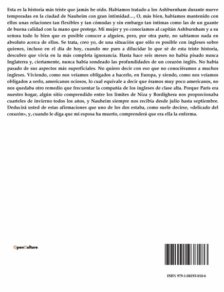 Esta es la historia más triste que jamás he oído. Habíamos tratado a los Ashburnham durante nueve temporadas en la ciudad de Nauheim con gran intimidad¿, O, más bien, habíamos mantenido con ellos unas relaciones tan flexibles y tan cómodas y sin embargo tan íntimas como las de un guante de buena calidad con la mano que protege. Mi mujer y yo conocíamos al capitán Ashburnham y a su señora todo lo bien que es posible conocer a alguien, pero, por otra parte, no sabíamos nada en absoluto acerca de ellos. Se trata, creo yo, de una situación que sólo es posible con ingleses sobre quienes, incluso en el día de hoy, cuando me paro a dilucidar lo que sé de esta triste historia, descubro que vivía en la más completa ignorancia. Hasta hace seis meses no había pisado nunca Inglaterra y, ciertamente, nunca había sondeado las profundidades de un corazón inglés. No había pasado de sus aspectos más superficiales. No quiero decir con eso que no conociéramos a muchos ingleses. Viviendo, como nos veíamos obligados a hacerlo, en Europa, y siendo, como nos veíamos obligados a serlo, americanos ociosos, lo cual equivale a decir que éramos muy poco americanos, no nos quedaba otro remedio que frecuentar la compañía de los ingleses de clase alta. Porque París era nuestro hogar, algún sitio comprendido entre los límites de Niza y Bordighera nos proporcionaba cuarteles de invierno todos los años, y Nauheim siempre nos recibía desde julio hasta septiembre. Deducirá usted de estas afirmaciones que uno de los dos estaba, como suele decirse, «delicado del corazón», y, cuando le diga que mi esposa ha muerto, comprenderá que era ella la enferma.