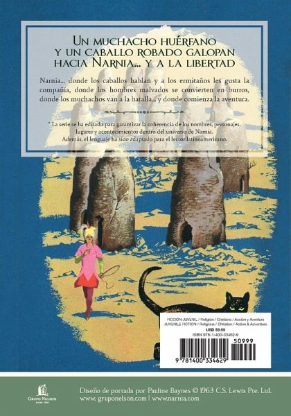 Narnia... donde los caballos hablan y a los ermitaños les gusta la compañía, donde los hombres malvados se convierten en burros, donde los muchachos van a la batalla... y donde comienza la aventura. Durante la Edad de Oro de Narnia, cuando Peter es Sumo Monarca, un niño llamado Shasta descubre que no es hijo de Arsheesh, un pescador de Calormen, y decide huir lejos, hacia el norte, a Narnia. Al ser confundido con otro fugitivo, Shasta llega a descubrir quién es en realidad e incluso encuentra a su verdadero padre. Por primera vez, el lenguaje de los siete libros clásicos ha sido adaptado para el lector latinoamericano y editado para garantizar la coherencia de los nombres, personajes, lugares y acontecimientos dentro del universo de Narnia. Además, presentan las cubiertas e ilustraciones originales de Pauline Barnes. Aunque forma parte de una saga, este es un libro independiente. Si quieres descubrir más sobre Narnia, puedes leer El príncipe Caspian, el cuarto libro de Las crónicas de Narnia. The Horse and His Boy Narnia... where horses talk and hermits like company, where evil men become donkeys, where boys go to battle... and where adventure begins. During the Golden Age of Narnia, when Peter is High Monarch, a boy named Shasta discovers that he is not the son of Arsheesh, a Calormen fisherman, and decides to run far north to Narnia. Being mistaken for another fugitive, Shasta comes to discover who he really is and even finds his real father. For the first time, the language of the seven classic books has been adapted for the Latin American reader and edited to ensure consistency of names, characters, places and events within the Narnia universe. In addition, they feature the original covers and illustrations by Pauline Barnes. Although it is part of a saga, this is a stand-alone book. If you want to discover more about Narnia, you can read Prince Caspian, the fourth book of The Chronicles of Narnia.
