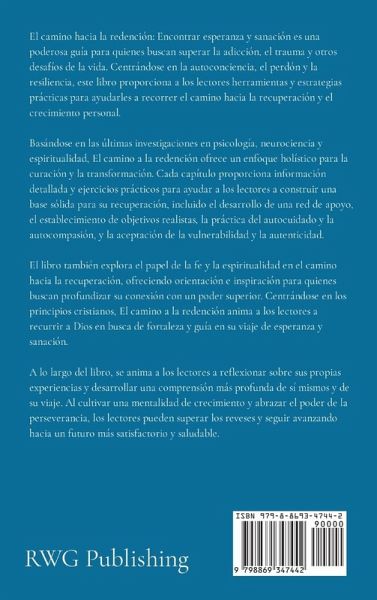El camino hacia la redención: Encontrar esperanza y sanación es una poderosa guía para quienes buscan superar la adicción, el trauma y otros desafíos de la vida. Centrándose en la autoconciencia, el perdón y la resiliencia, este libro proporciona a los lectores herramientas y estrategias prácticas para ayudarles a recorrer el camino hacia la recuperación y el crecimiento personal. Basándose en las últimas investigaciones en psicología, neurociencia y espiritualidad, El camino a la redención ofrece un enfoque holístico para la curación y la transformación. Cada capítulo proporciona información detallada y ejercicios prácticos para ayudar a los lectores a construir una base sólida para su recuperación, incluido el desarrollo de una red de apoyo, el establecimiento de objetivos realistas, la práctica del autocuidado y la autocompasión, y la aceptación de la vulnerabilidad y la autenticidad. El libro también explora el papel de la fe y la espiritualidad en el camino hacia la recuperación, ofreciendo orientación e inspiración para quienes buscan profundizar su conexión con un poder superior. Centrándose en los principios cristianos, El camino a la redención anima a los lectores a recurrir a Dios en busca de fortaleza y guía en su viaje de esperanza y sanación. A lo largo del libro, se anima a los lectores a reflexionar sobre sus propias experiencias y desarrollar una comprensión más profunda de sí mismos y de su viaje. Al cultivar una mentalidad de crecimiento y abrazar el poder de la perseverancia, los lectores pueden superar los reveses y seguir avanzando hacia un futuro más satisfactorio y saludable. Escrito con compasión y empatía, El camino a la redención es una lectura obligada para cualquiera que busque superar adicciones, traumas u otros desafíos de la vida. Ya sea que recién esté comenzando su viaje de recuperación o esté buscando profundizar su comprensión de sí mismo y su fe, este libro le brinda las herramientas y la inspiración que necesita para lograr una transformación y curación duraderas.