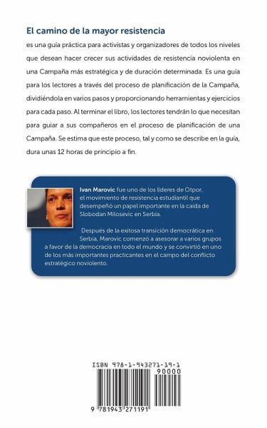 El camino de la mayor resistencia: Una guía para planificar Campañas noviolentas es una guía práctica para activistas y organizadores de todos los niveles que desean hacer crecer sus actividades de resistencia noviolenta en una Campaña más estratégica y de duración determinada. Es una guía para los lectores a través del proceso de planificación de la Campaña, dividiéndola en varios pasos y proporcionando herramientas y ejercicios para cada paso. Al terminar el libro, los lectores tendrán lo que necesitan para guiar a sus compañeros en el proceso de planificación de una Campaña. Se estima que este proceso, tal y como se describe en la guía, dura unas 12 horas de principio a fin. La guía está dividida en dos partes. La primera presenta y contextualiza las herramientas de planificación de Campañas y sus objetivos. También explica la lógica detrás de estas herramientas y cómo pueden ser modificadas para adaptarse mejor al contexto de un grupo en particular. La segunda parte proporciona planes de lecciones fácilmente reproducibles y compartibles para el uso de cada una de esas herramientas, y explora cómo integrar las herramientas en el más amplio proceso de planificación.