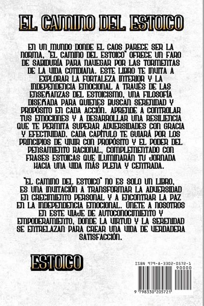 El Camino del Estoico: Descubre la fortaleza en la simplicidad de la virtud En un mundo donde el caos parece ser la norma, "El Camino del Estoico" ofrece un faro de sabiduría para navegar por las tormentas de la vida cotidiana. Este libro te invita a explorar la fortaleza interior y la independencia emocional a través de las enseñanzas del estoicismo, una filosofía diseñada para quienes buscan serenidad y propósito en cada acción. Aprende a controlar tus emociones y a desarrollar una resiliencia que te permita superar adversidades con gracia y efectividad. Cada capítulo te guiará por los principios de vivir con propósito y el poder del pensamiento racional, complementado con frases estoicas que iluminarán tu jornada hacia una vida más plena y centrada. "El Camino del Estoico" no es solo un libro, es una invitación a transformar la adversidad en crecimiento personal y a encontrar la paz en la independencia emocional. Únete a nosotros en este viaje de autoconocimiento y empoderamiento, donde la virtud y la serenidad se entrelazan para crear una vida de verdadera satisfacción.