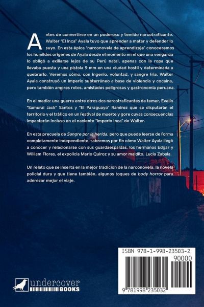 Antes de convertirse en un poderoso y temido narcotraficante, Walter "El Inca" Ayala tuvo que aprender a matar y defender lo suyo. En esta épica narconovela de aprendizaje conoceremos los humildes orígenes de Ayala desde el momento en el que una venganza lo obligó a exiliarse lejos de su Perú natal, apenas con la ropa que llevaba puesta y una pistola 9 mm en una ciudad hostil y determinada a quebrarlo. Veremos cómo con ingenio, voluntad y sangre fría, Walter Ayala construyó un imperio subterráneo a base de violencia y cocaína, pero también amores rotos, amistades peligrosas y gastronomía peruana. En el medio: una guerra entre otros dos narcotraficantes de temer, Evelio "Samurai Jack" Santos y "El Paraguayo" Ramírez que se disputarán el territorio y el tráfico en un festival de muerte y gore cuyas consecuencias impactarán incluso en el naciente "imperio Inca" de Walter. En esta precuela de Sangre por la herida, pero que puede leerse de forma completamente independiente, sabremos por fin cómo Walter Ayala llegó a conocer y relacionarse con sus guardaespaldas, los hermanos Edgar y William Flores, el expolicía Mario Quiroz y su amor maldito, Lucía Zabala. Un relato que se inserta en la mejor tradición de la narconovela, la novela policial dura y que tiene, también, algunos toques de body horror para aderezar mejor el viaje.