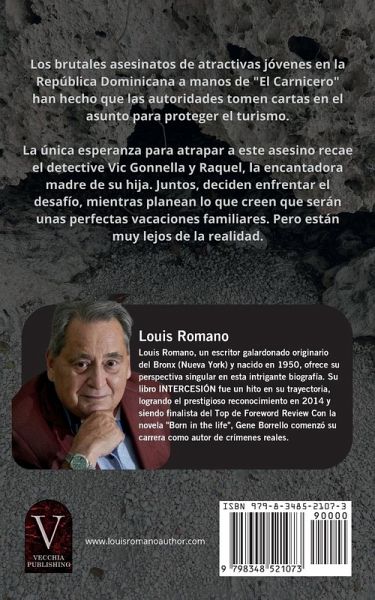 Los brutales asesinatos de atractivas jóvenes en la República Dominicana a manos de "El Carnicero" han hecho que las autoridades tomen cartas en el asunto para proteger el turismo. La única esperanza para atrapar a este asesino recae el detective Vic Gonnella y Raquel, la encantadora madre de su hija. Juntos, deciden enfrentar el desafío, mientras planean lo que creen que serán unas perfectas vacaciones familiares. Pero están muy lejos de la realidad. CAPÍTULO 1 "Amigo, qué espléndido día para disfrutar del golf. Este lugar es verdaderamente un paraíso para los amantes de este deporte. Para mí, es mucho más atractivo que Pebble Beach", comentó el conductor del carrito de golf. El cielo azul brillaba sin una sola nube. Las olas blancas se estrellaban contra el agua azul verdosa del magnífico mar, chocando con el coral natural y las grandes rocas negras que flanqueaban las calles esmeraldas y los cuidados greens del campo. El conductor del carrito formaba parte de un grupo de cuatro golfistas provenientes de Nueva Jersey, quienes se encontraban jugando en el hoyo 9 del club de golf Punta Espada, en Punta Cana, República Dominicana. El cuarteto había comenzado su partida a las siete de la mañana, y ya para las nueve y cuarto se encontraban en la curva. En el tee del hoyo 9, un golfista se acercó y colocó su bola blanca en el tee. Se retiró un paso para evaluar la trayectoria de su golpe. Realizó dos swings de práctica antes de dirigirse a la bola para llevar a cabo su tiro. El golfista, que parecía estar en la mediana edad, hizo un movimiento de swing lento hacia atrás, pero al momento de impactar, dejó caer ligeramente su hombro izquierdo. El resultado de su golpe fue decepcionante, lo que llevó a que soltase una palabra que provocó risas entre sus compañeros. El drive se desvió hacia la izquierda, aterrizando en un búnker de desecho frente a una cueva de coral grisáceo, ....
