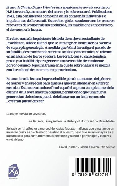 El caso de Charles Dexter Ward es una apasionante novela escrita por H.P. Lovecraft, un maestro del terror y lo sobrenatural. Publicada en 1941, está considerada como una de las obras más influyentes e inquietantes de Lovecraft. Este relato gótico se adentra en los oscuros recovecos del conocimiento prohibido, las maldiciones ancestrales y el descenso a la locura. El relato narra la inquietante historia de un joven estudiante de Providence, Rhode Island, que se sumerge en los misterios oscuros de su propia genealogía. A medida que Ward investiga el pasado de su familia, desentrañando secretos ocultos y ancestrales, se adentra en un abismo de terror y locura. Lovecraft, con su característica prosa y su habilidad para generar una sensación de inminente horror cósmico, teje una trama en la que lo sobrenatural se mezcla con la realidad de una manera perturbadora. Es una obra de lectura imprescindible para los amantes del género de horror y en especial para quienes quieren ahondar en el terror cósmico. Esta nueva traducción al español captura completamente la esencia de la obra maestra original, permitiendo que una nueva generación de lectores pueda deleitarse con un texto como solo Lovecraft puede ofrecer.