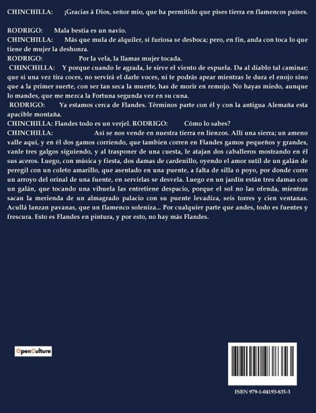 CHINCHILLA: ¡Gracias á Dios, señor mío, que ha permitido que pises tierra en flamencos países. RODRIGO: Mala bestia es un navío. CHINCHILLA: Más que mula de alquiler, si furiosa se desboca; pero, en fin, anda con toca lo que tiene de mujer la deshonra. RODRIGO: Por la vela, la llamas mujer tocada. CHINCHILLA: Y porque cuando le agrada, le sirve el viento de espuela. Da al diablo tal caminar; que si una vez tira coces, no servirá el darle voces, ni te podrás apear mientras le dura el enojo sino que a la primer suerte, con ser tan seca la muerte, has de morir en remojo. No hayas miedo, aunque lo mandes, que me mezca la Fortuna segunda vez en su cuna. RODRIGO: Ya estamos cerca de Flandes. Términos parte con él y con la antigua Alemaña esta apacible montaña. CHINCHILLA: Flandes todo es un verjel. RODRIGO: Cómo lo sabes? CHINCHILLA: Así se nos vende en nuestra tierra en lienzos. Allí una sierra; un ameno valle aquí, y en él dos gamos corriendo, que tambien corren en Flandes gamos pequeños y grandes, vanle tres galgos siguiendo, y al trasponer de una cuesta, le atajan dos caballeros mostrando en él sus aceros. Luego, con música y fiesta, dos damas de cardenillo, oyendo el amor sutil de un galán de peregil con un coleto amarillo, que asentado en una puente, a falta de silla o poyo, por donde corre un arroyo del orinal de una fuente, en servirlas se desvela. Luego en un jardín están tres damas con un galán, que tocando una vihuela las entretiene despacio, porque el sol no las ofenda, mientras sacan la merienda de un almagrado palacio con su puente levadiza, seis torres y cien ventanas. Acullá lanzan pavanas, que un flamenco soleniza... Por cualquier parte que andes, todo es fuentes y frescura. Esto es Flandes en pintura, y por esto, no hay más Flandes.