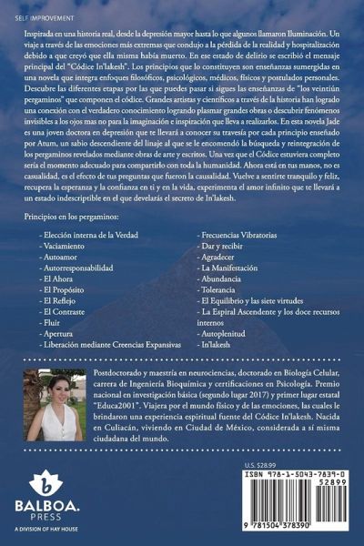 Inspirada en una historia real, desde la depresión mayor hasta lo que algunos llamaron Iluminación. Un viaje a través de las emociones más extremas que condujo a la pérdida de la realidad y hospitalización debido a que creyó que ella misma había muerto. En ese estado de delirio se escribió el mensaje principal del "Códice In’lakesh". Los principios que lo constituyen son enseñanzas sumergidas en una novela que integra enfoques filosóficos, psicológicos, médicos, físicos y postulados personales. Descubre las diferentes etapas por las que puedes pasar si sigues las enseñanzas de "los veintiún pergaminos" que componen el códice. Grandes artistas y científicos a través de la historia han logrado una conexión con el verdadero conocimiento logrando plasmar grandes obras o descubrir fenómenos invisibles a los ojos mas no para la imaginación e inspiración que lleva a realizarlos. En esta novela Jade es una joven doctora en depresión que te llevará a conocer su travesía por cada principio enseñado por Atum, un sabio descendiente del linaje al que se le encomendó la búsqueda y reintegración de los pergaminos revelados mediante obras de arte y escritos. Una vez que el Códice estuviera completo sería el momento adecuado para compartirlo con toda la humanidad. Ahora está en tus manos, no es casualidad, es el efecto de tus preguntas que fueron la causalidad. Vuelve a sentirte tranquilo y feliz, recupera la esperanza y la confianza en ti y en la vida, experimenta el amor infinito que te llevará a un estado indescriptible en el que develarás el secreto de In’lakesh. Principios en los pergaminos: - Elección interna de la Verdad - Vaciamiento - Autoamor - Autorresponsabilidad - El Ahora - El Propósito - El Reflejo - El Contraste - Fluir - Apertura - Liberación mediante Creencias Expansivas - Frecuencias Vibratorias - Dar y recibir - Agradecer - La Manifestación - Abundancia - Tolerancia - El Equilibrio y las siete virtudes - La Espiral Ascendente y los doce recursos internos - Autoplenitud - In’lakesh