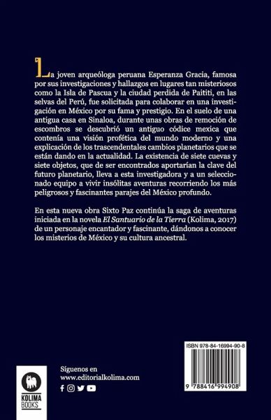 La joven arqueóloga peruana Esperanza Gracia, famosa por sus investigaciones y hallazgos en lugares tan misteriosos como la Isla de Pascua y la ciudad perdida de Paititi, en las selvas del Perú, había sido solicitada para colaborar en una investigación en México por su fama y prestigio. En el suelo de una antigua casa en Sinaloa, durante unas obras de remoción de escombros se descubrió un antiguo códice mexica que contenía una visión profética del mundo moderno y una explicación de los trascendentales cambios planetarios que se están dando en la actualidad. La existencia de siete cuevas y siete objetos, que de ser encontrados aportarían la clave del futuro planetario, lleva a esta investigadora y a un seleccionado equipo a vivir insólitas aventuras recorriendo los más peligrosos y fascinantes parajes del México profundo. En esta nueva obra Sixto Paz continúa la saga de aventuras de un personaje encantador y fascinante, dándonos a conocer los misterios de México y su cultura ancestral.