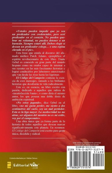 La nueva edición del Código del campeón contiene la esencia de los mensajes expuestos por Dante Gebel en su carrera evangelística, a lo que se suman brillantes historias que desafiarán tu vida radicalmente. Este libro es para aquellos que sufren de 'insatisfacción santa', o como diría el mismo autor: Los que poseen una doble dosis de ambición espiritual. Una obra literaria, que formará parte de la historia de todos aquellos que desean marcar significativamente este planeta. En resumen: El código