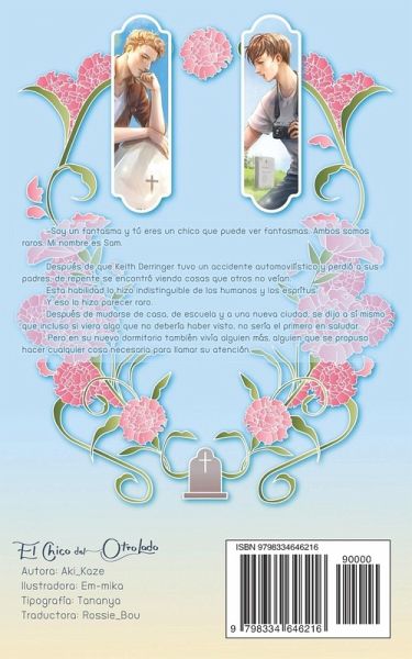 El Chico del Otro Lado (The Boy on the Other Side Spanish translation) >-Soy un fantasma y tú eres un chico que puede ver fantasmas. Ambos somos raros. Mi nombre es Sam. Después de que Keith Derringer tuvo un accidente automovilístico y perdió a sus padres, de repente se encontró viendo cosas que otros no veían. Esta habilidad lo hizo indistinguible de los humanos y los espíritus. Y eso lo hizo parecer raro. Después de mudarse de casa, de escuela y a una nueva ciudad, se dijo a sí mismo que incluso si viera algo que no debería haber visto, no sería el primero en saludar. >Advertencia Está historia contiene bullying escolar, suicidio y depresión.