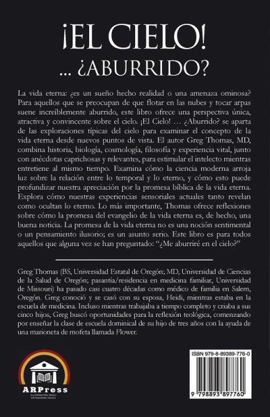 La vida eterna: ¿es un sueño hecho realidad o una amenaza ominosa? Para aquellos que se preocupan de que flotar en las nubes y tocar arpas suene increíblemente aburrido, este libro ofrece una perspectiva única, atractiva y convincente sobre el cielo. ¡El Cielo! ... ¿Aburrido? se aparta de las exploraciones típicas del cielo para examinar el concepto de la vida eterna desde nuevos puntos de vista. El autor Greg Thomas, MD, combina historia, biología, cosmología, filosofía y experiencia vital, junto con anécdotas caprichosas y relevantes, para estimular el intelecto mientras entretiene al mismo tiempo. Examina cómo la ciencia moderna arroja luz sobre la relación entre lo temporal y lo eterno, y cómo esto puede profundizar nuestra apreciación por la promesa bíblica de la vida eterna. Explora cómo nuestras experiencias sensoriales actuales tanto revelan como ocultan lo eterno. Lo más importante, Thomas ofrece reflexiones sobre cómo la promesa del evangelio de la vida eterna es, de hecho, una buena noticia. La promesa de la vida eterna no es una noción sentimental o un pensamiento ilusorio; es un asunto serio. Este libro es para todos aquellos que alguna vez se han preguntado: "¿Me aburriré en el cielo?"