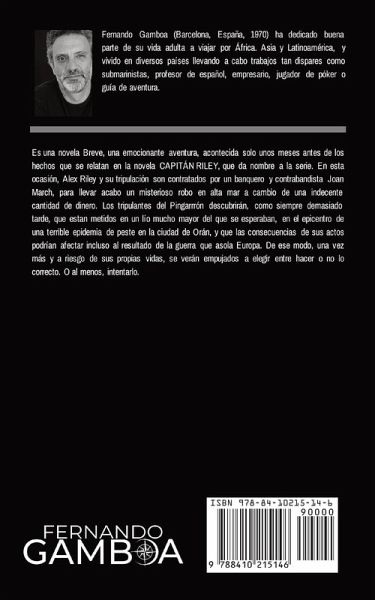 La nueva entrega de la serie de espionaje y aventuras Nº1 en Amazon España. Delicioso Emocionante No parar de leer Quiero más! Perfecta de principio a fin Imprescindible y deseable EL CIELO SOBRE ORÁN es una novela breve, una emocionante aventura, acontecida solo unos meses antes de los hechos que se relatan en la novela CAPITÁN RILEY, que da nombre a la serie. En esta ocasión, Alex Riley y su tripulación son contratados por el banquero y contrabandista Joan March, para llevar a acabo un misterioso robo en alta mar a cambio de una indecente cantidad de dinero. Los tripulantes del Pingarrón descubrirán, como siempre demasiado tarde, que están metidos en un lío mucho mayor del que se esperaban, en el epicentro de una terrible epidemia de peste en la ciudad de Orán, y que las consecuencias de sus actos podrían afectar incluso al resultado de la guerra que asola Europa. De ese modo, una vez más y a riesgo de sus propias vidas, se verán empujados a elegir entre hacer o no lo lo correcto. O al menos, intentarlo. EL CIELO SOBRE ORÁN, es un thriller de aventuras y espionaje que no requiere haber leído previamente Capitán Riley para disfrutarlo; más bien al contrario, es una buena introducción para descubrir a los personajes protagonistas, ya que es menos extenso que los anteriores libros de la serie. Una novela breve pero intensa, cuajada de acción, romance, humor y unas gotas de sexo, que disfrutará desde la primera a la última página. Así que, si quiere subir a bordo, tome su petate y prepárese para embarcar, pues el capitán ha dado orden de zarpar al romper el alba, y ya empieza a clarear por el este. Nos vemos en el Pingarrón.