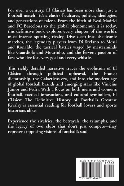 For over a century, El Clásico has been more than just a football match-it's a clash of cultures, politics, ideologies, and generations of talent. From the birth of Real Madrid and FC Barcelona to the global phenomenon it is today, this definitive book explores every chapter of the world's most intense sporting rivalry. Dive deep into the iconic matches, the legendary players from Di Stéfano to Messi and Ronaldo, the tactical battles waged by masterminds like Guardiola and Mourinho, and the fervent passion of fans who live for every goal and every whistle. This richly detailed narrative traces the evolution of El Clásico through political upheaval, the Franco dictatorship, the Galácticos era, and into the modern age of global football brands and emerging stars like Vinícius Júnior and Pedri. With a focus on both men's and women's football, tactical innovations, and cultural symbolism, El Clásico: The Definitive History of Football's Greatest Rivalry is essential reading for football lovers and sports historians alike. Experience the rivalries, the betrayals, the triumphs, and the legacy of two clubs that don't just compete-they represent opposing visions of football's soul.