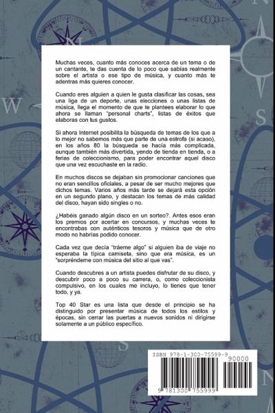 Top 40 Star es una lista que desde el principio se ha distinguido por presentar música de todos los estilos y épocas, sin cerrar las puertas a nuevos sonidos ni dirigirse solamente a un público específico. En este libro voy a iniciar el repaso a cómo se ha producido la evolución, desde una lista que haces para tu gusto personal, hasta su emisión en todo el planeta, pasando por las emisoras de radioaficionado, las locales,..., al mismo tiempo que se transforman los gustos del gran público, los medios de comunicación y, con ellos, la sociedad en los últimos años