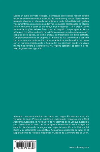 Desde un punto de vista filológico, los trabajos sobre léxico habrían estado mayoritariamente enfocados al estudio de sustantivos y verbos. Este volumen pretende ahondar en el estudio del adjetivo a partir del análisis lexicográfico y documental de un conjunto de adjetivos cromáticos atestiguados en el siglo XVII y extraídos a partir de un corpus muy específico ¿el Corpus Léxico de Inventarios (CorLexIn)¿. En el plano lexicográfico, se persigue acotar su referencia cromática partiendo de la información que puede extraerse de diccionarios de la época, así como analizar su tratamiento en dicho contexto. Complementariamente, se propone un análisis de tipo documental a partir de los datos que proporcionan los corpus académicos, conformados por textos con un marcado registro culto, y frente a los que CorLexIn aporta una visión mucho más cercana a la lengua oral y al registro cotidiano, es decir, a la realidad lingüística del siglo XVII.