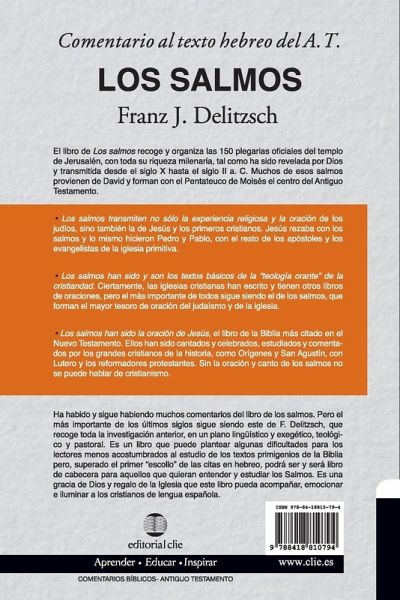 Obra cumbre de la ex¿¿gesis, teolog¿¿a y aplicaci¿¿n pastoral del Libro de los Salmos en los ¿¿ltimos dos siglos; forma parte de la colecci¿¿n de Comentarios exeg¿¿ticos al texto hebreo del Antiguo Testamento, realizada por F. Delitzsch en colaboraci¿¿n con K. F. Keil, y va a ser presentada en lengua castellana. Es imprescindible para conocer a fondo los salmos y, por eso, ha sido preparada por la Editorial Clie como un libro b¿¿sico para el conocimiento, estudio y experiencia de los salmos entre los cristianos, hombres y mujeres, m¿¿s comprometidos en lengua castellana. Esta obra recoge el proceso de composici¿¿n e interpretaci¿¿n jud¿¿a del Libro de los Salmos, desde el tiempo de David (siglo X a. C.) hasta la fijaci¿¿n del texto masor¿¿tico hebreo (siglo IX d. C.), tal como ha sido transmitido, vocalizado y precisado con acentos, m¿¿sica y vivencia espiritual a lo largo de los siglos. Al mismo tiempo muestra y desenträ¿a la historia de la interpretaci¿¿n de los salmos, con las traducciones m¿¿s significativas a las diversas lenguas de Europa, desde el griego de los LXX (siglo III a. C.), el arameo de los targumes y la peschita (siglo I-IV d. C.), pasando por el lat¿¿n de San Jer¿¿nimo (Vulgata, siglo IV d. C.), hasta Lutero (siglo XVI d. C.), con los Padres de la Reforma Protestantes y el resto de las iglesias cristianas (cat¿¿lica, ortodoxa) de la modernidad. Commentary on the Hebrew Text of the Old Testament - Psalms This is the culminating work of exegesis, theology, and pastoral application of the Psalms in the last two centuries; it is part of the collection of Exegetical Commentaries to the Hebrew text of the Old Testament, written by F. Delitzsch in collaboration with K. F. Keil, and it is going to be presented in Spanish. It is essential to know the Psalms in depth and, for this reason, it has been prepared by Editorial Clie as a basic book for the knowledge, study, and experience of the Psalms among Christians and the men and women most committed to Christianity and religion in the Spanish language. This work gathers the process of Jewish composition and interpretation of the Psalms, from the time of David (10th century B.C.) to the fixation of the Hebrew Masoretic text (9th century A.D.), as it has been transmitted, vocalized, and refined with accents, music, and spiritual experience throughout the centuries. At the same time it shows and unravels the history of the interpretation of the Psalms, with the most significant translations into the various languages of Europe, from the Greek of the LXX (3rd century B.C.), the Aramaic of the Targums, and the Peschita (1st-4th century A.D.), through the Latin of the Bible (4th century A.D.), and the Latin of the Bible (4th century A.D.). C.), passing through the Latin of St. Jerome (Vulgate, 4th century A.D.), up to Luther (16th century A.D.), with the Fathers of the Protestant Reformation and the rest of the Christian churches (Catholic, Orthodox) of modernity.