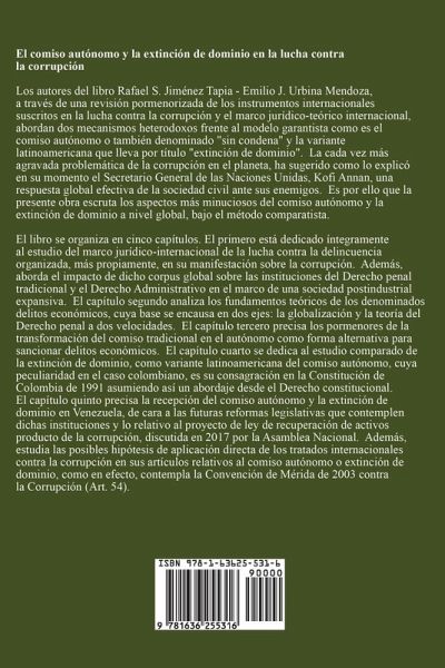 Los autores del libro, a través de una revisión pormenorizada de los instrumentos internacionales suscritos en la lucha contra la corrupción y el marco jurídico-teórico internacional, abordan dos mecanismos heterodoxos frente al modelo garantista como es el comiso autónomo o también denominado "sin condena" y la variante latinoamericana que lleva por título "extinción de dominio". La cada vez más agravada problemática de la corrupción en el planeta ha sugerido, como lo explicó en su momento el Secretario General de las Naciones Unidas, Kofi Annan, una respuesta global efectiva de la sociedad civil ante sus enemigos. Es por ello que la presente obra escruta los aspectos más minuciosos del comiso autónomo y la extinción de dominio a nivel global, bajo el método comparatista. El libro se organiza en cinco capítulos. El primero está dedicado íntegramente al estudio del marco jurídico-internacional de la lucha contra la delincuencia organizada, más propiamente, en su manifestación sobre la corrupción. Además, aborda el impacto de dicho corpus global sobre las instituciones del Derecho penal tradicional y el Derecho Administrativo en el marco de una sociedad postindustrial expansiva. El capítulo segundo analiza los fundamentos teóricos de los denominados delitos económicos, cuya base se encausa en dos ejes: la globalización y la teoría del Derecho penal a dos velocidades. El capítulo tercero precisa los pormenores de la transformación del comiso tradicional en el autónomo como forma alternativa para sancionar delitos económicos. El capítulo cuarto se dedica al estudio comparado de la extinción de dominio, como variante latinoamericana del comiso autónomo, cuya peculiaridad en el caso colombiano, es su consagración en la Constitución de Colombia de 1991 asumiendo así un abordaje desde el Derecho constitucional. El capítulo quinto precisa la recepción del comiso autónomo y la extinción de dominio en Venezuela, de cara a las futuras reformas legislativas que contemplen dichas instituciones y lo relativo al proyecto de ley de recuperación de activos producto de la corrupción, discutida en 2017 por la Asamblea Nacional. Además, estudia las posibles hipótesis de aplicación directa de los tratados internacionales contra la corrupción en sus artículos relativos al comiso autónomo o extinción de dominio, como en efecto, contempla la Convención de Mérida de 2003 contra la Corrupción (Art. 54)..