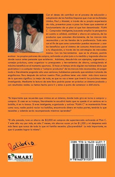 Con el deseo de contribuir en el proceso de educación y adaptación de las familias hispanas que viven en los Estados Unidos, Paul y Massiel, a través de su propia experiencia de vida, presentan paso a paso las fases que sustentan el funcionamiento de un plan al que han denominado PLAN C - Comprador Inteligente, buscando ampliar la perspectiva en cuanto a calidad, cantidad y ahorro en compras, de los productos que consumes diariamente, de las marcas más reconocidas y en las tiendas de tu preferencia. Todo esto con el fin de que como consumidor puedas reconocer y usar los beneficios que el sistema de consumo Americano pone a tu disposición, a través de las estrategias de mercadeo masivo. Con las herramientas que se te ofrecen, podrás evaluar tus propios patrones de compra, activando un plan justo a tu medida y logrando ahorros donde nunca antes pensaste que existieran. Asimismo, descubrirás con ejemplos, sugerencias y consejos prácticos, como organizar tu presupuesto y herramientas de ahorro, consiguiendo el máximo beneficio en el momento oportuno. Si hace un tiempo atrás alguien nos hubiese dicho que podríamos ir a cualquier tienda a "comprar productos" de las marcas más reconocidas, sin pagar nada o literalmente pagando sólo unos centavos, hubiésemos pensado que estaban tratando de engañarnos. Pero después de activar nuestro Plan, pudimos tener una visión más clara acerca de lo que esto significa. Lo mejor de todo, es que no vas a tener que invertir los próximos meses investigando. Mediante la lectura de este libro podrás poner en práctica un sistema probado y con resultados reales. Lo hemos hecho para ti y estas a punto de comenzar a disfrutarlo. "Es importante que recuerdes que vivimos en un sistema, donde todo gira en torno a comprar y comprar. Si caes en su trampa, literalmente te sacudirá hasta que no quede ni un centavo en tu bolsillo, ni en tu banco. Si eres inteligente, organizado y activas "PLAN C" te mantendrás firme como roca, nadie podrá vaciar tus bolsillos, encontrarás dinero en todas partes, tendrás lo que necesites y además serás recompensado mientras aprendes!" ------------------------------------------------------------------------------------ "El año pasado, tuve un ahorro de $2,000 en compras de supermercado activando el Plan C. Y este año voy por más, en sólo 7 meses, mis ahorros rozan ya los $1,200 y mi despensa está más llena que nunca de todo lo que mi familia necesita. ¿Sorprendido? Lo más importante, es que tú puedes lograr lo mismo".