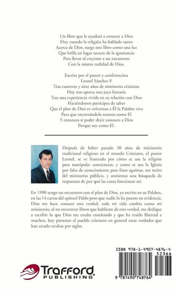 Un libro que le ayudará a conocer a Dios Hoy cuando la religión ha hablado tanto Acerca de Dios, surge este libro como una luz Que brilla en lugar oscuro de la ignorancia Para llevar al creyente a un encuentro Con la misma realidad de Dios. Escrito por el pastor y conferencista Leonel Sánchez F Tras cuarenta y siete años de ministerio cristiano Hoy nos aporta esta joya literaria Tras una experiencia vivida en su relación con Dios Haciéndonos partícipes de saber Que el plan de Dios es volvernos a Él la Palabra viva Para que encarnándola seamos como El Y entonces sí poder decir conozco a Dios Porque soy como El.