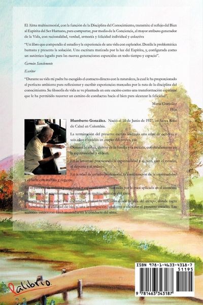 El Alma multisensorial, con la función de la Disciplina del Conocimiento, transmite el reflejo del Bien al Espíritu del Ser Humano, para comportar, por medio de la Conciencia, el mayor atributo generador de la Vida, con racionalidad, verdad, armonía y felicidad individual y colectiva. "Un libro que compendia el estudio y la experiencia de una vida con esplendor. Destila la problemática humana y presenta la solución. Una escritura matizada por la luz del Espíritu, y, configurada como un auténtico legado para las nuevas generaciones esparcidas en todo tiempo y espacio". Germán Sanclemente Escritor "Durante su vida mi padre ha escogido el contacto directo con la naturaleza, la cual le ha proporcionado el perfecto ambiente para reflexionar y escribir experiencias marcadas por la ruta de la disciplina del conocimiento. Su filosofía de vida se ve plasmada en este escrito como una transformación espiritual que le ha permitido recorrer un camino de conductas hacia el bien para alcanzar la felicidad". María González Hija