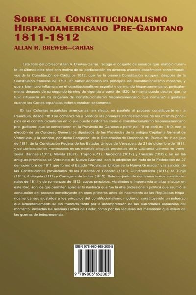 Este libro del profesor Allan R. Brewer-Carías, recoge el conjunto de ensayos que elaboró durante los últimos diez años con motivo de su participación en diversos eventos académicos conmemorativos de la Constitución de Cádiz de 1812, que fue la primera Constitución europea, después de la Constitución francesa de 1791, en haber adoptado los principios del constitucionalismo moderno, y que si bien tuvo influencia en el constitucionalismo español y del mundo hispanoamericano, particularmente después de su segundo término de vigencia a partir de 1820, la misma puede decirse que no tuvo influencia en los orígenes del constitucionalismo hispanoamericano, que comenzó a gestarse cuando las Cortes españolas todavía estaban sesionando. En las Colonias españolas americanas, en efecto, en paralelo al proceso constituyente en la Península, desde 1810 se comenzaron a producir las primeras manifestaciones de los mismos principios en el constitucionalismo en lo que puede calificarse como el constitucionalismo hispanoamericano pre-gaditano; que se concretaron en la Provincia de Caracas a partir del 19 de abril de 1810, con la elección de un Congreso General de diputados de las Provincias de la antigua Capitanía General de Venezuela, y la sanción, por dicho Congreso, de la Declaración de Derechos del Pueblo de 1º de julio de 1811, de la Constitución Federal de los Estados Unidos de Venezuela de 21 de diciembre de 1811, y de Constituciones Provinciales en las mismas antiguas provincias de la Capitanía General de Venezuela: Barinas (1811), Mérida (1811), Trujillo (811), Barcelona (1812) y Caracas (1812); así en las antiguas provincias del Virreinato de Nueva Granada, con la adopción del Acta de la Federación de 27 de noviembre de 1811 que formó el Estado "Provincias Unidas de la Nueva Granada;" y la sanción de las Constituciones provinciales de los Estados de Socorro (1810), Cundinamarca (1811), de Tunja (1811), Antioquia (1812) y Cartagena de Indias (1812). Este conjunto de riquísimos textos constitucionales de 1811 y de comienzos de 1812, cuyos principios, vicisitudes e importancia analiza el autor en este libro, son los que permiten apreciar lo ilustrada que fue la élite profesional y política que asumió la conducción del proceso constituyente en esos primeros años del nacimiento de las Repúblicas hispanoamericanas, ajustados a los principios del constitucionalismo moderno, constituyendo un esfuerzo que lamentablemente se vio truncado tanto por la incomprensión de las autoridades españolas del momento, incluidas las mismas Cortes de Cádiz, como por las secuelas del militarismo que derivó de las guerras de independencia.