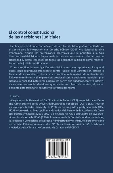 Este libro del profesor Rafael Chavero Gazdik, que es el undécimo número de la Colección Monografías coeditada por el Centro para la Integración y el Derecho (CIEP) y la Editorial Jurídica Venezolana, estudia las pretensiones procesales que permiten a la Sala Constitucional del Tribunal Supremo de Justicia de Venezuela, controlar la constitucionalidad (y hasta la legalidad) de todas las decisiones judiciales como manifestación de la justicia constitucional. Para tal efecto, la investigación la dividió el autor en cinco capitulos en los cuales, luego de pronunciarse sobre el control judicial de la Constitución, estudia la facultad de avocamiento, el recuso extraordinario de revisión de sentencias definitivamente firmes y el amparo constitucional contra decisiones judiciales, precisamdo su finalidad, naturaleza jurídica, las partes que pueden incoar y/o intervenir en este proceso, las decisiones que pueden ser objeto de revisión, el procedimiento para tramitar el recurso y los efectos del mismo.