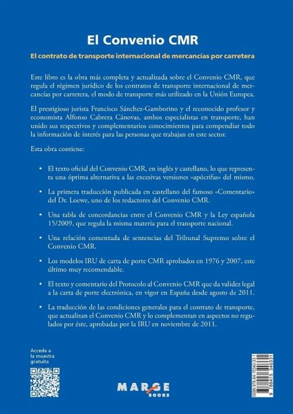 Esta es la obra más completa y actualizada sobre el Convenio CMR, que regula el régimen jurídico de los contratos de transporte internacional de mercancías por carretera. El prestigioso jurista Francisco Sánchez-Gamborino y el reconocido economista y profesor Alfonso Cabrera Cánovas, ambos especialistas en transporte, han unido sus respectivos y complementarios conocimientos para compendiar todo la información de interés para las personas que trabajan en este sector. Esta obra contiene: El texto oficial del Convenio CMR, en inglés y español, lo que representa una óptima alternativa a las excesivas versiones apócrifas del mismo. - La primera traducción publicada en español del famoso Comentario del Dr. Loewe, uno de los redactores del Convenio CMR. - Una relación comentada de sentencias del Tribunal Supremo sobre el Convenio CMR. - Los modelos IRU de carta de porte CMR aprobados en 1976 y 2007, este último muy recomendable. - El texto y comentario del Protocolo al Convenio CMR que da validez legal a la carta de porte electrónica. - La traducción de las condiciones generales para el contrato de transporte, que actualizan el Convenio CMR y lo complementan en aspectos no regulados por éste.