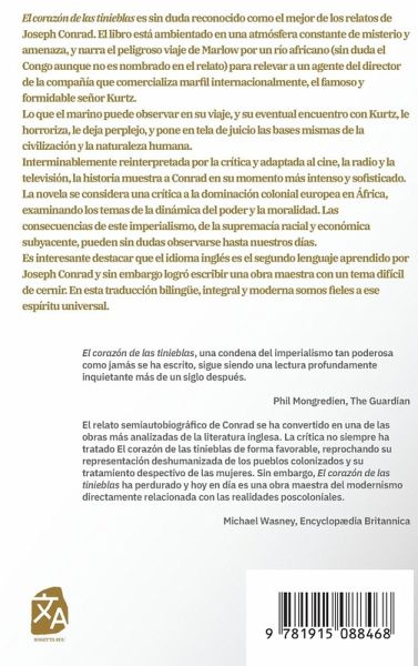 El corazón de las tinieblas es sin duda reconocido como el mejor de los relatos de Joseph Conrad. El libro está ambientado en una atmósfera constante de misterio y amenaza, y narra el peligroso viaje de Marlow por un río africano (sin duda el Congo aunque no es nombrado en el relato) para relevar a un agente del director de la compañía que comercializa marfil internacionalmente, el famoso y formidable señor Kurtz. Lo que el marino puede observar en su viaje, y su eventual encuentro con Kurtz, le horroriza, le deja perplejo, y pone en tela de juicio las bases mismas de la civilización y la naturaleza humana. Interminablemente reinterpretada por la crítica y adaptada al cine, la radio y la televisión, la historia muestra a Conrad en su momento más intenso y sofisticado. La novela se considera una crítica a la dominación colonial europea en África, examinando los temas de la dinámica del poder y la moralidad. Las consecuencias de este imperialismo, de la supremacía racial y económica subyacente, pueden sin dudas observarse hasta nuestros días. Es interesante destacar que el idioma inglés es el segundo lenguaje aprendido por Joseph Conrad y sin embargo logró escribir una obra maestra con un tema difícil de cernir. En esta traducción bilingüe, integral y moderna somos fieles a ese espíritu universal.