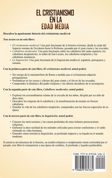 Descubra la apasionante historia del cristianismo medieval Tres textos en un solo libro: El cristianismo medieval: Una guía fascinante de la historia cristiana, desde la caída del Imperio romano de Occidente hasta la Reforma, pasando por el gran cisma y las cruzadas. Caballeros medievales: Una guía fascinante sobre los caballeros del santo sepulcro, los caballeros hospitalarios, la orden de San Lázaro, los caballeros templarios y los caballeros teutónicos. La Inquisición: Una guía fascinante de la Inquisición medieval, española, portuguesa y romana. Si usted es un entusiasta de la historia, un erudito religioso o simplemente siente curiosidad por el pasado, este libro lo transportará a una época de cambios, fe profunda y legados perdurables. .