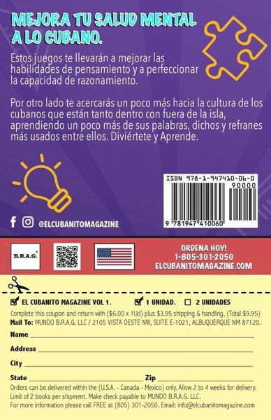 El Cubanito Magazine. Juegos para la Salud Mental a lo Cubano. Estos juegos te llevarán a mejorar las habilidades de pensamiento y perfeccionar la capacidad de razonamiento, aprenderás a superar los desafíos y agudizar tu inteligencia. Estos juegos son: 1. Marcar la respuesta correcta. 2. Encontrar las palabras ocultas. 3. Encontrar las 10 diferencias. 4. Crucigramas. Todos los juegos están relacionados con la jerga cubana, eso quiere decir que, al mismo tiempo aprenderás la mayoría de las Palabras y Refranes mas usados por los cubanos tanto dentro como fuera de la isla. También tiene incluido un completo diccionario de la jerga cubana para que te sirva de ayuda en las palabras que no conoces. Recuerda que los pasatiempos son una buena manera de mantener tu Salud Mental joven y en forma, y que tambien te ayudan a prevenir enfermedades como el Alzheimers o la demencia.