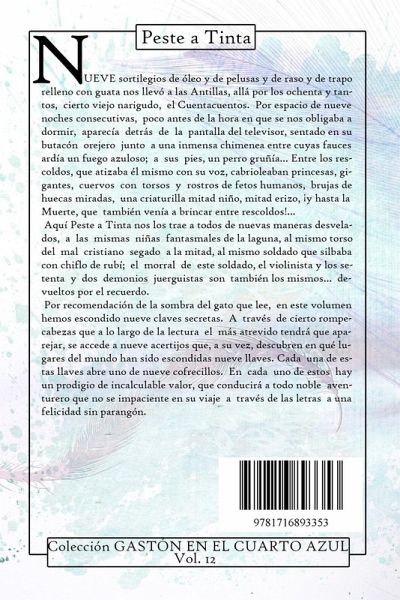 Nueve sortilegios de óleo y de pelusas y de raso y de trapo relleno con guata nos llevó a las Antillas, allá por los ochenta y tantos, cierto viejo narigudo, el Cuentacuentos. Por espacio de nueve noches consecutivas, poco antes de la hora en que se nos obligaba a dormir, aparecía detrás de la pantalla del televisor, sentado en su butacón orejero junto a una inmensa chimenea entre cuyas fauces ardía un fuego azuloso; a sus pies, un perro gruñía... Entre los rescoldos, que atizaba él mismo con su voz, cabrioleaban princesas, gigantes, cuervos con torsos y rostros de fetos humanos, brujas de huecas miradas, una criaturilla mitad niño, mitad erizo, ¡y hasta la Muerte, que también venía a brincar entre rescoldos!... Aquí Peste a Tinta nos los trae a todos de nuevas maneras desvelados, a las mismas niñas fantasmales de la laguna, al mismo torso del mal cristiano segado a la mitad, al mismo soldado que silbaba con chiflo de rubí; el morral de este soldado, el violinista y los setenta y dos demonios juerguistas son también los mismos... devueltos por el recuerdo. Por recomendación de la sombra del gato que lee, en este volumen hemos escondido nueve claves secretas. A través de cierto rompecabezas que a lo largo de la lectura el más atrevido tendrá que aparejar, se accede a nueve acertijos que, a su vez, descubren en qué parajes del mundo han sido escondidas nueve llaves. Cada una de estas llaves abre uno de nueve cofrecillos. En cada uno de estos hay un prodigio de incalculable valor, que conducirá a todo noble aventurero que no se impaciente en su viaje a través de las letras a una felicidad sin parangón.