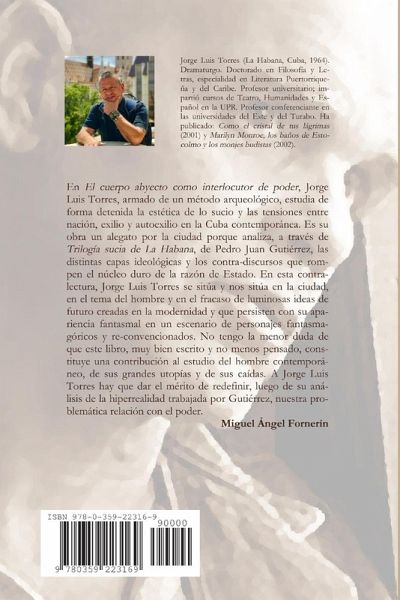 En El cuerpo abyecto como interlocutor del poder, Jorge Luis Torres analiza la suciedad de los relatos de Pedro Juan Gutiérrez para (de)construir la semántica oficialista del canon político y cultural de la Nación y (re)legitimar ¿y (re)situar en la estética del realismo sucio y del hiperrealismö la obra de un autor marcado por la desautorización literaria. Jorge Luis Torres estudia Trilogía sucia de La Habana para explicar por qué La Habana de Pedro Juan Gutiérrez no se puede evocar como pasado celestial, sino que se debe (re)vivir como desecho, como polución, como impureza.