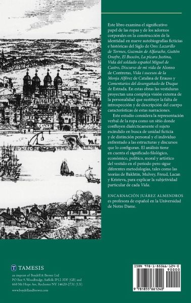 This book examines the significant role of clothing and other corporeal decorations in the construction of identity in nine fictional and historical Golden Age autobiographies: Lazarillo de Tormes, Guzmán de Alfarache, Guitón Onofre, El Buscón, La pícara Justina, Vida del soldado español Miguel de Castro, Discurso de mi vidaI> by Alonso Contreras, Vida i sucesos de la Monja Alférez by Catalina de Erauso and Comentarios del desengañado by Duque de Estrada. Attire in these works projects a complex external vision of the personality, which substitutes the characteristic lack of introspection and description of the body in these accounts. This study considers the verbal representation of clothing as a site where the divided subject in search of a fictitious unity and individual distinction and the subject conformed by structures and discourses converge dialectically. This analysis takes into account the philological, economical, political, moral and artistic meaning of costume in this period but follows different methodologies, such as the theories of Bakhtin, Mulvey, Freud, Lacan and Kristeva, to explain the particular subjectivity of each Life