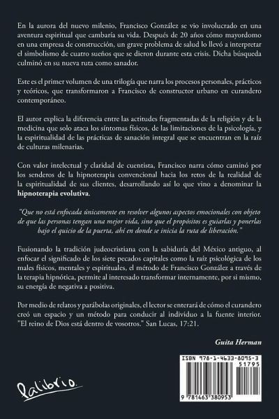En la aurora del nuevo milenio, Francisco González se vio involucrado en una aventura espiritual que cambaría su vida. Después de 20 años cómo mayordomo en una empresa de construcción, un grave problema de salud lo llevó a interpretar el simbolismo de cuatro sueños que se dieron durante esta crisis. Dicha búsqueda culminó en su nueva ruta como sanador. Este es el primer volumen de una trilogía que narra los procesos personales, prácticos y teóricos, que transformaron a Francisco de constructor urbano en curandero contemporáneo. El autor explica la diferencia entre las actitudes fragmentadas de la religión y de la medicina que solo ataca los síntomas físicos, de las limitaciones de la psicología, y la espiritualidad de las prácticas de sanación integral que se encuentran en la raíz de culturas milenarias. Con valor intelectual y claridad de cuentista, Francisco narra cómo caminó por los sendero de la hip- noterapia convencional hacia los retos de la realidad de la espiritualidad de sus clientes, desarro- llando así lo que vino a denominar la hipnoterapia evolutiva. "Que no está enfocada únicamente en resolver algunos aspectos emocionales con objeto de que las personas tengan una mejor vida, sino que el propósitos es guiarlas y ponerlas bajo el quicio de la puerta, ahí en donde se inicia la ruta de liberación." P. 183-? Fusionando la tradición judeocristiana con la sabiduría del México antiguo, al enfocar el significado de los siete pecados capitales como la raíz psicológica de los males físicos, mentales y espirituales, el método de Francisco González a través de la terapia hipnótica, permite al interesado transformar internamente, por si mismo, su energía de negativa a positiva. Por medio de amenos y poderoso relatos y parábolas originales, el lector se enterará de cómo el curandero creó un espacio y un método para conducir al individuo a la fuente interior. "El reino de Dios está dentro de vosotros. San Lucas," 17:21 Guita Herman