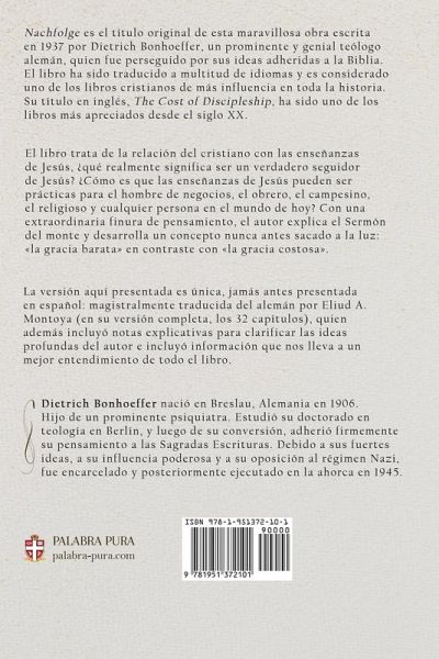Dietrich Bonhoeffer fue un doctor en teología alemán de gran prominencia, quien vivió en los tiempos de Hitler. Mientras que la inmensa mayoría de los líderes eclesiásticos de su tiempo adoptaron una actitud pasiva -y hasta de apoyo- al régimen Nazi, Bonhoeffer se opuso poderosamente a éste, se atrevió a hablar públicamente en su contra, y predicó los principios establecidos por las Escrituras que respaldaban su mensaje; y ¡todo esto lo hizo dentro de Alemania! Estas acciones temerarias le costaron su encarcelamiento y posterior ejecución el 9 de abril de 1945, tan sólo a unos días de la derrota alemana. ¿¿ Bonhoeffer escribió prolíficamente en su corta vida, pero este libro es una verdadera joya: explica con gran profundidad y erudición el Sermón del monte y otros pasajes claves en el Nuevo Testamento que definen lo que significa ser un verdadero discípulo de Jesús hoy: ¿Qué significa el llamado de Jesús para el hombre de negocios, el militar, el obrero o el erudito? ¿Qué fue lo que realmente Jesús quiso decir con sus enseñanzas? ¿Cuál es su voluntad para nosotros hoy? Bonhoeffer responde a estas y muchas otras preguntas y acuña los conceptos de la gracia barata y la gracia costosa. El libro ha sido traducido a multitud de idiomas y es considerado uno de los libros cristianos de más influencia en toda la historia. Su título en inglés, The Cost of Discipleship ha vendido cientos de miles de copias y ha sido uno de los libros más apreciados desde el siglo XX. La versión aquí presentada es única, jamás antes publicada en español: magistralmente traducida directamente del alemán por Eliud A. Montoya (en su versión completa, los 32 capítulos), quien además incluyó notas explicativas para clarificar las ideas profundas del autor e información que nos lleva a un mejor entendimiento de todo el libro. Mediante este libro usted aprenderá:El significado hoy de la gracia barata en contraposición con la gracia costosa (conceptos acuñados por el propio Bonhoeffer). Todo lo circundante al llamado de los discípulos de Jesús Lo que significa la cruz para los discípulos El discipulado como algo netamente individual La explicación de las bienaventuranzas de Mateo 5 La orden de Jesús en cuanto a nuestra relación con el prójimo La ley de Jesús en cuanto al adulterio La ley de Jesús en cuanto al juramento Lo referente a la justicia y al castigo del agresor En cuanto a las prácticas ocultas de la vida cristiana El discípulo y su relación con los incrédulos Las funciones y responsabilidades del discípulo Los sufrimientos del discípulo Las recompensas del discípulo La iglesia y el discipulado: los sacramentos El significado más profundo del bautismo en agua El significado del cuerpo de Cristo Lo que imagen de Cristo significa para el cristiano de hoy