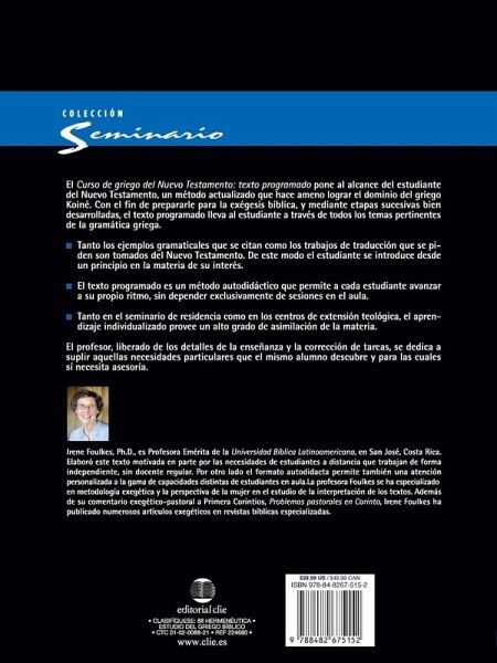 Curso de Griego tiene el prop¿¿sito de capacitar al estudiante de la Biblia para leer el Nuevo Testamento en griego. Contiene material para comprender las estructuras gramaticales y obtener una base fundamental para la comprensi¿¿n del idioma. Es parte de una colecci¿¿n del Programa Acad¿¿mico del Seminario Evang¿¿lico Unido de Teolog¿¿a con sede en Madrid. El libro es fundamentalmente did¿¿ctico y se encuentra organizado en peque¿¿as etapas para su estudio. Incluye: Orientaci¿¿n para el estudiante. Contenido did¿¿ctico e interactivo. Cuestionarios, cuadros de repaso, res¿¿menes. Organizaci¿¿n adecuada para estudio por lapsos. Greek Course Greek Course has the purpose of training the Bible student to read the New Testament in Greek. It contains material to understand grammatical structure and obtain a fundamental basis for understanding the language. It is part of a collection of the Academic Program of the United Evangelical Seminary of Theology based in Madrid. The book is very didactic and is organized in small stages for study. It includes: Orientation for the student. Educational and interactive content. Questionnaires, review charts, summaries. Adequate organization for study by lapses.
