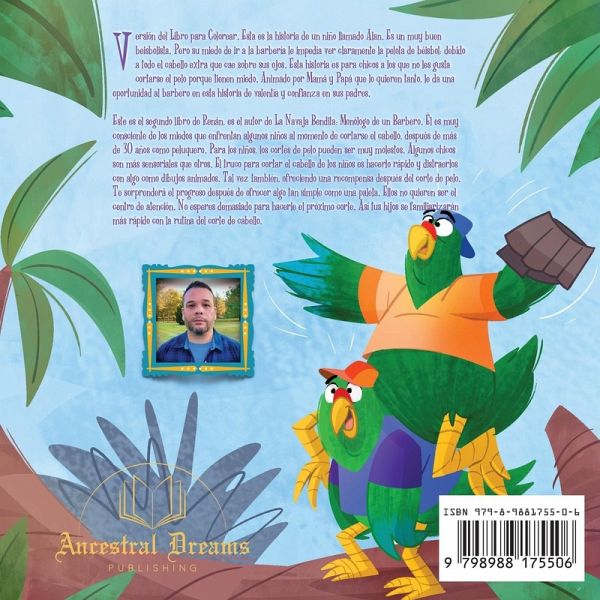 Esta es la versión del libro para colorear. Esta es la historia de un niño llamado Alan. Es un muy buen beisbolista. Pero su miedo de ir a la barbería le impedía ver claramente la pelota de béisbol; debido a todo el cabello extra que cae sobre sus ojos. Esta historia es para chicos a los que no les gusta cortarse el pelo porque tienen miedo. Animado por Mamá y Papá que lo quieren tanto, le da una oportunidad al barbero en esta historia de valentía y confianza en sus padres.Este es el segundo libro de Renán, es el autor de La Navaja Bendita: Monólogo de un Barbero. Él es muy consciente de los miedos que enfrentan algunos niños al momento de cortarse el cabello, después de más de 30 años como peluquero. Para los niños, los cortes de pelo pueden ser muy molestos. Algunos chicos son más sensoriales que otros. El truco para cortar el cabello de los niños es hacerlo rápido y distraerlos con algo como dibujos animados. Tal vez también, ofreciendo una recompensa después del corte de pelo. Te sorprenderá el progreso después de ofrecer algo tan simple como una paleta. Ellos no quieren ser el centro de atención. No esperes demasiado para hacerle el próximo corte. Así tus hijos se familiarizarán más rápido con la rutina del corte de cabello.